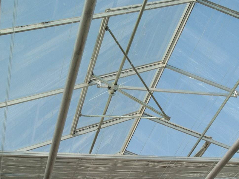 連續(xù)開(kāi)窗系統(tǒng),由若干排齒輪齒條,在驅(qū)動(dòng)軸的帶動(dòng)下,將溫室窗戶進(jìn)行開(kāi)啟。連續(xù)開(kāi)窗適用于各種類型的溫室,可有效提高溫室通風(fēng)面積,達(dá)到增加溫室通風(fēng)降溫的效果。主要設(shè)備配件有減速電機(jī)、傳動(dòng)軸、齒條、齒輪、軸承座等。扭距分配式開(kāi)窗系統(tǒng)是連續(xù)式開(kāi)窗的一種,由一臺(tái)減速電機(jī)驅(qū)動(dòng)一系列扭距分配器,扭距分配器作用于連續(xù)開(kāi)窗的驅(qū)動(dòng)軸,實(shí)現(xiàn)開(kāi)窗。交錯(cuò)開(kāi)窗系統(tǒng)又稱為推桿開(kāi)窗系統(tǒng),適用于Venlo型溫室。開(kāi)窗時(shí),齒輪齒條在驅(qū)動(dòng)軸帶動(dòng)下運(yùn)動(dòng),推動(dòng)推桿向前運(yùn)動(dòng),在支撐臂的作用下,將窗戶打開(kāi)。交錯(cuò)式開(kāi)窗僅適用于頂開(kāi)窗系統(tǒng)。交錯(cuò)式開(kāi)窗因齒輪齒條機(jī)構(gòu)不同而分為軌道式和擺臂式兩種形式。二者主要區(qū)別于,前者單根齒條推力大,可適用長(zhǎng)度較大的溫室,后者適用于長(zhǎng)度較小,但結(jié)構(gòu)簡(jiǎn)單,造價(jià)較低。系統(tǒng)組成:齒輪、齒條、推拉桿、減速電機(jī)、驅(qū)動(dòng)軸、支撐臂等附件。
