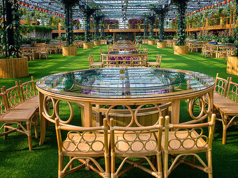 綠色生態(tài)餐廳中廳采用大型鋼結(jié)構(gòu)形式,跨度大,高度高、可植入高大樹(shù)木,設(shè)置亭臺(tái),造景時(shí)有更大的發(fā)揮空間,使景色更加逼真。中廳周圍設(shè)置其他配套連棟溫室,大部分餐飲設(shè)置于其中,降低大大的造價(jià)和后期維護(hù)費(fèi)用,同時(shí)保證了充足的活動(dòng)空間,美景美食交相輝映,相得益彰。
